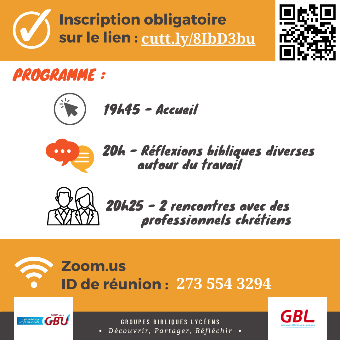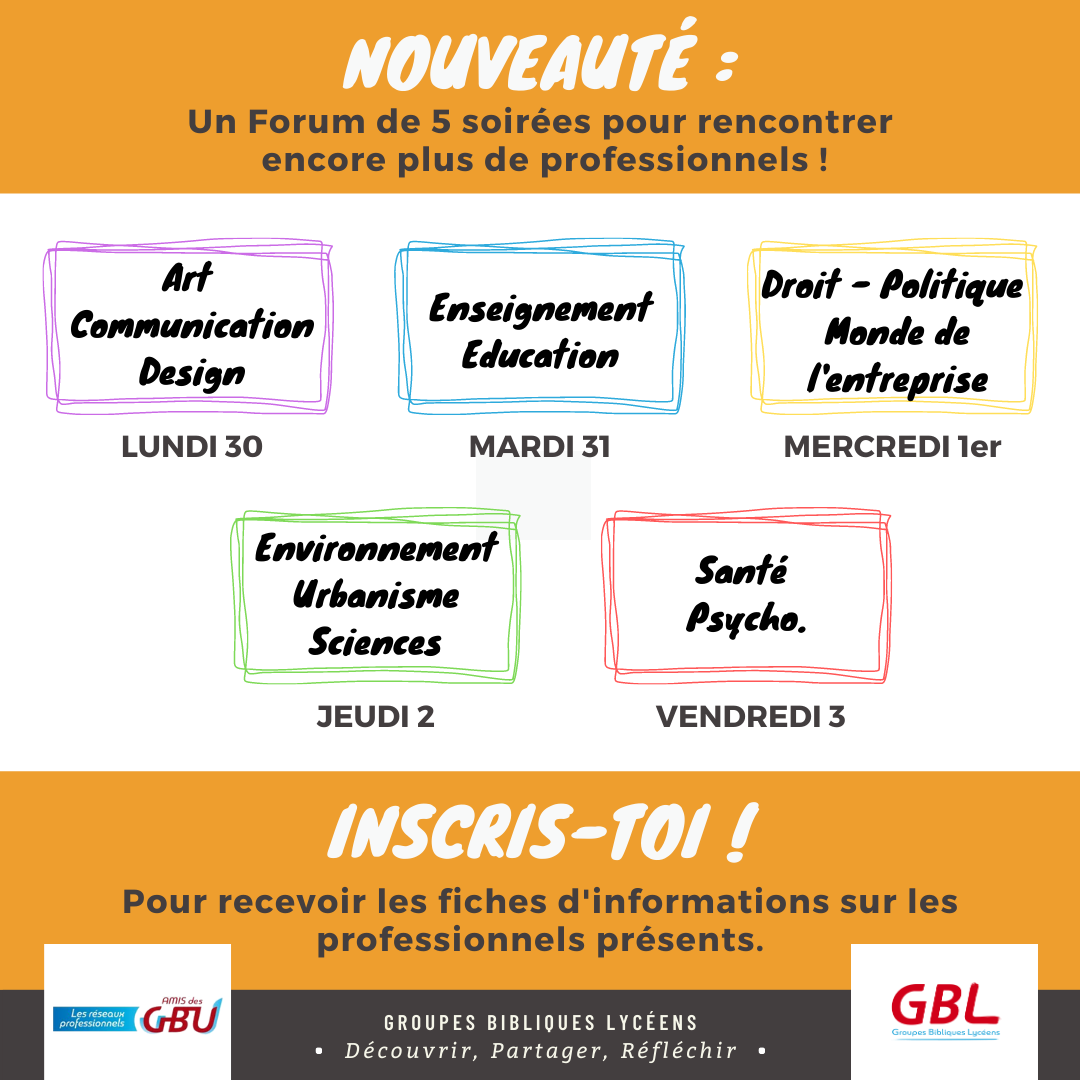 L’objectif de cet événement organisé par les GBL est de permettre aux lycéens français de s’intéresser de près à la vision biblique du travail, de leur donner des outils dans le choix de leur orientation professionnelle, et de leur permettre d’échanger avec des professionnels chrétiens.